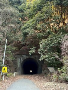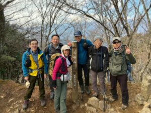 歩き始めは1時間半ほどのひたすらの登り。急登ではないのでキツくはないのですが、杉の木に囲まれ眺望も無くそろそろ飽きた・・・頃から始まる危険箇所の数々。注意を促す看板もあちこちに立ち、崩落箇所は目も眩むよう。土がすっかり削り取られ、根の力だけでなんとか耐えてるホソホソの痩せ尾根。木の橋は渡してあるものの、左右は切れ落ち下も丸見えじゃん!ここ渡るの〜?!と高所恐怖症がムクムクと顔を出す・・・「格好なんてどうでもいいんだ。落ちずに渡れ!」と「ガンバガンバ」と後ろから励まされ、超へっぴり腰でやっとこさ。そして三峰山の3つのピークは、登ったり降ったりと頑張り甲斐がありますね〜。途中一緒になった若者4人組とも「キツイね〜。怖かったね〜。」と山頂でねぎらい合い、写真を撮ってもらいました。そこへお一人歩きのベテラン女性。キツかったと言いつつも、もう少し先でお昼にするとスッと通過していかれました。さすがと思いましたが、狭い山頂、若者4人と我々6人で一杯だった・・・休みたかったかな。申し訳ない・・・そこからまたいくつかの登り下りを過ぎてからの下りも急勾配。何ヶ所かの立派な鎖に助けられ、ようやく辿り着いた山神隊道。真っ暗なトンネルをヘッドライトで照らし、出た所でゴールは近い。あとは舗装道路を30分位かな、なんて話してるところに少し遅れて到着の、この計画発案の裏リーダ。「そっちはつまんないから、こっちだよ」なんて右手の山の中を指差します。確かに、そのコースを知らせる看板も有り、「つまんない」なんて言われたら「面白い」方に行くに決まってますよ。そして向かった鐘ヶ嶽山頂へ向かう山道。いきなりの急登!ずるずる斜面もあり、すっかり終了モードになっていた体を呼び起こすのが一苦労・・・ちょっと回り道のつもりが、コースタイム1時間40分!?言い出しっぺの裏リーダはじめ、みんなそこそこヨレヨレではないですか。しかし入ってしまったら歩くしかないので、励まし合いながらなんとかバス停まで到着。今度こそ、ほんとに終了。面白い楽しいオマケ歩き、ありがとうございました。